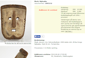 Man har alltså plötsligt avlägsnat "Proveniens: Gabriel & Daphy Müller" från en hel grupp föremål som drogs ut för någon vecka sedan när fekalierna träffade takfläkten så att säga och väljer i stället att sälja dem på nytt. Nu dock helt utan kommentarer om eventuell proveniens. Innebär detta att Lauritz experter efter kovändning plötsligt anser att dessa masker som tidigare var försedda med Müller-proveniens alltså är moderna turistkopior?